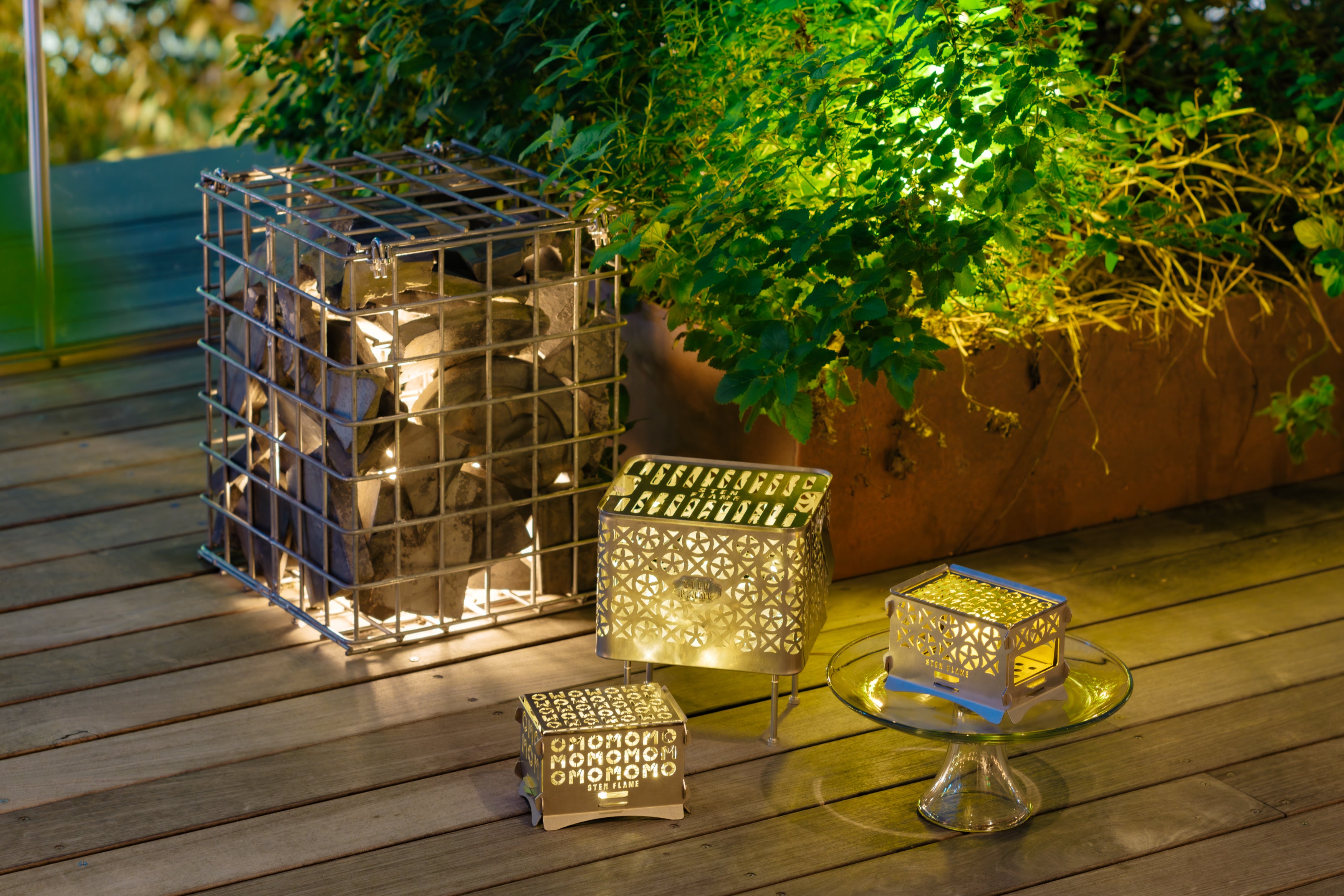 お城と呼応する設計デザインの「凸凹テラス」は、熊本城がライトアップする日没に合わせて明かりが灯り、そのデザインを更に際立たせます。例えば、茶臼山の地形に沿って建てられたお城の郭から着想を得た、でこぼこと段差のあるウッドデッキや、震災で瓦礫(がれき)となった熊本城の瓦を使用したライト、豊かな植栽にも明かりが灯り、夜ならではの落ち着いた空間へと変化します。また、ご近所さんでステンレスを使用し、焚き火台を制作する「丸山ステンレス工業」のライトが、「OMOベース」と「凸凹テラス」のテーブルに登場。熊本の県花、リンドウや伝統工芸品の肥後手毬から着想を得たデザインに加え、OMO5熊本のオリジナルライトも現れ、「OMO」のロゴデザインが、幻想的に揺らぎます。