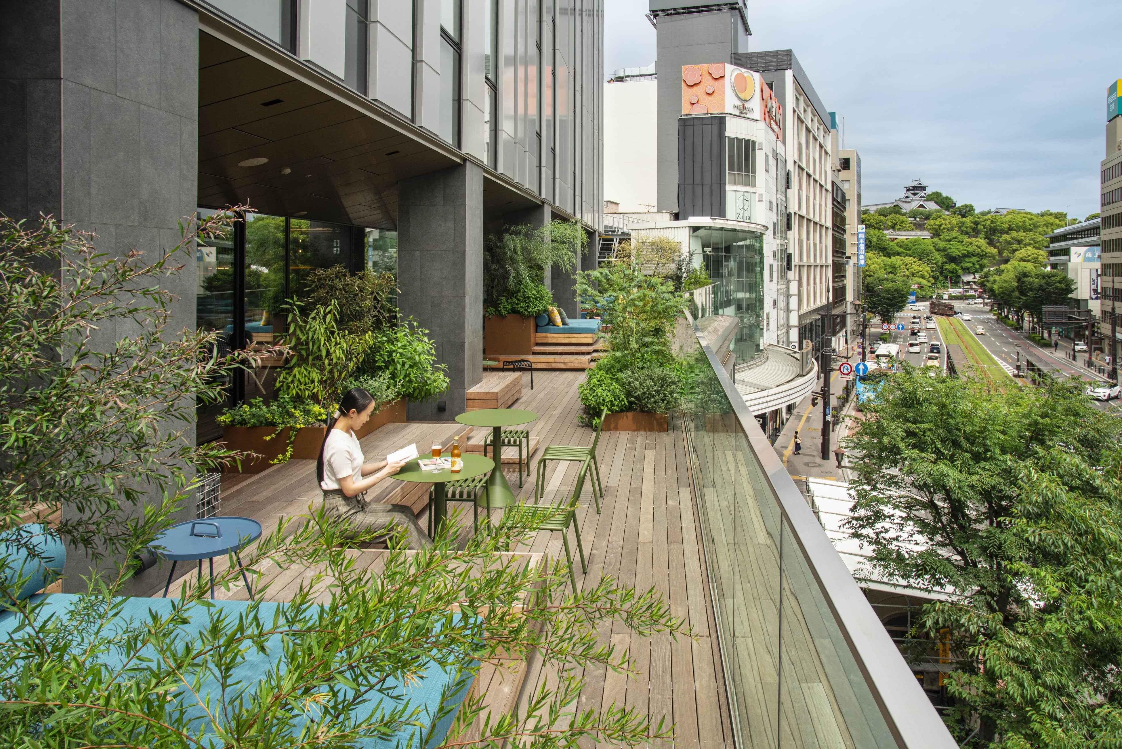 OMO5熊本の一番の特徴は、熊本城を望む「凸凹テラス」です。夜の「凸凹テラス」では、熊本城のライトアップに合わせて明かりが灯り、お城と呼応する建築デザインがより一層際立ちます。私たちはこの空間を生かし、熊本らしさを感じられる体験をしてほしいと考え、この街のシンボルである熊本城を主役に掲げました。お客様には熊本城をテーマに、ご近所さんの「むしゃんよか」な活動や、清正公さんと繋がる歴史に触れ、夜風に当たりながら街の賑わいを満喫してほしいと考えています。