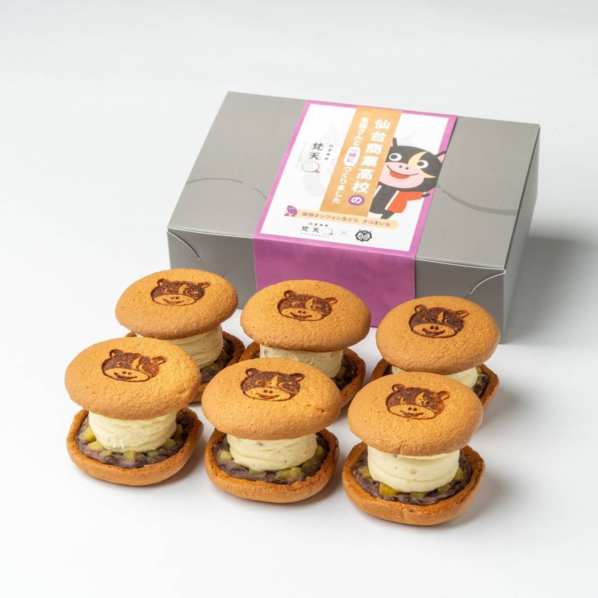 地元宮城の農家で栽培された「紅はるか」を1カ月以上熟成させたものを使用。シフォンケーキの生地はふんわり軽やかで、クリームには熟成した「紅はるか」のペーストをたっぷり混ぜ込み、蜜芋の口当たりと独特のさつまいもの香りを楽しめます。餡にはダイス状の「紅はるか」を贅沢に使い、見た目は豪華でも甘さは控えめで、飽きのこない味わいを提供します。仙台商業高校のマスコットべこたんの焼き印と掛紙でオリジナル感も満載です。