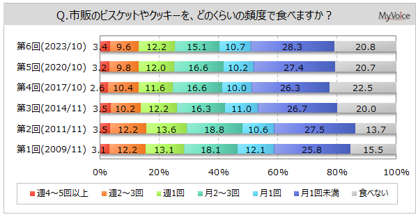 <今 回>(2023/10)https://myel.myvoice.jp/products/detail.php?product_id=30304 上記設問の他に、「ビスケット・クッキーを食べる場面」「購入場所」も聞いています。 <第5回>(2020/10)https://myel.myvoice.jp/products/detail.php?product_id=26703 <第4回>(2017/10)https://myel.myvoice.jp/products/detail.php?product_id=23103 |