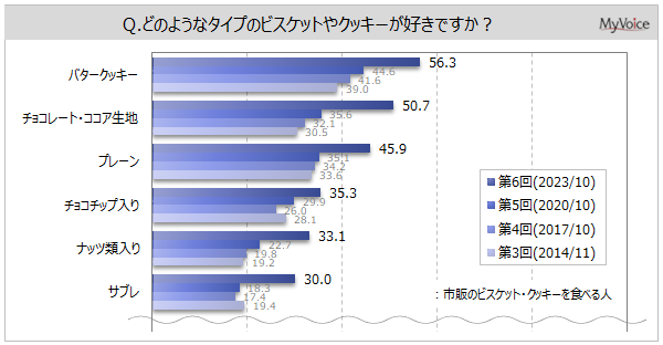 「バタークッキー」「チョコレート・ココア生地」が各50%台、「プレーン」が45.9%、「チョコチップ入り」「ナッツ類入り」「サブレ」が各30%台です。
