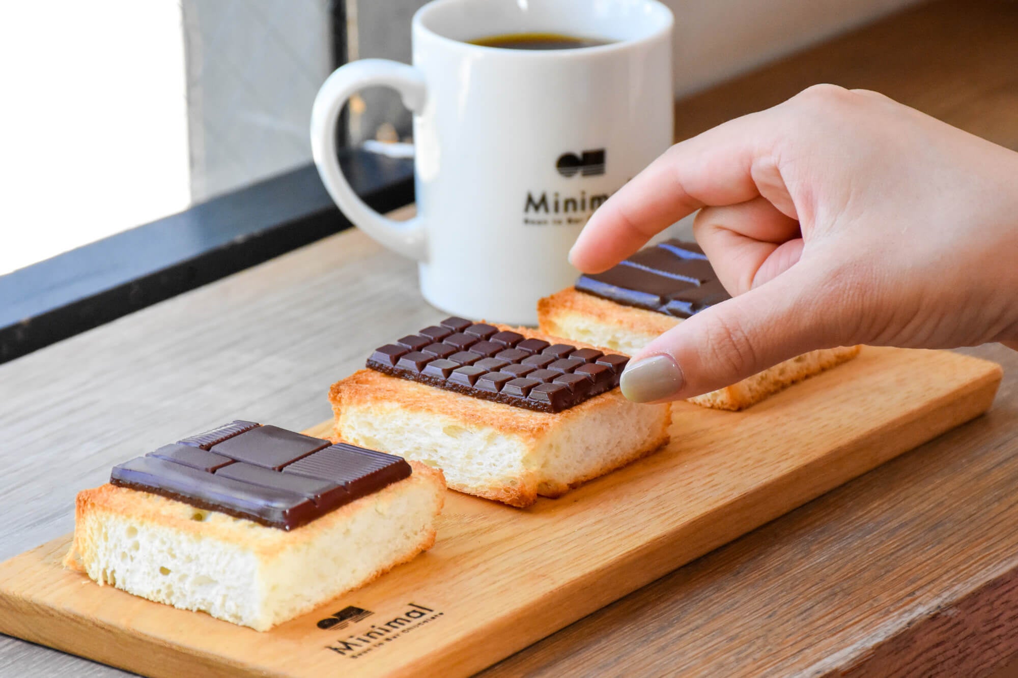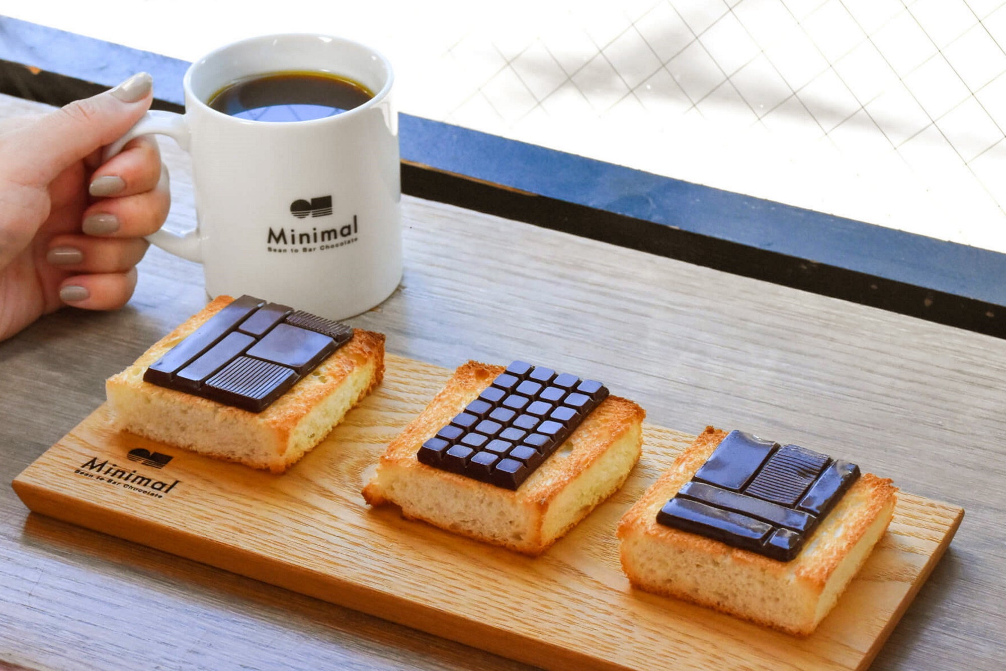 「チョコレートトーストセット」は、Minimalの定番フレーバー「CLASSIC」「’Arhuaco」「NUTTY」の3種を、温かいトーストとお飲み物と一緒に楽しめるセットです。