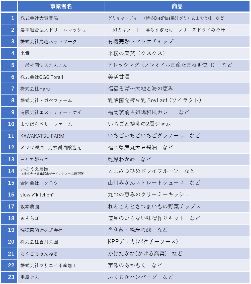 まるごとにっぽん浅草店での催事販売では、福岡県産農林水産物を活用した商品を59品目取り揃えております。出店事業者は下記のとおりです。