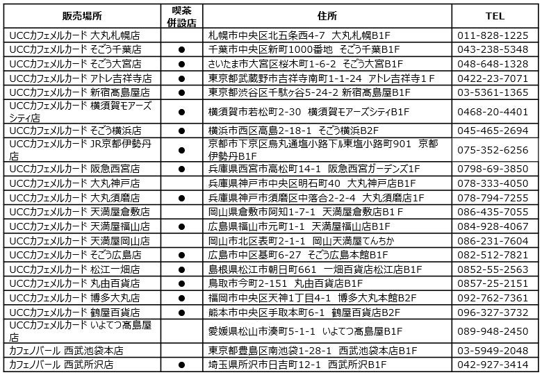 取り扱い店舗一覧(コーヒー豆挽き売り業態「UCCカフェメルカード」20店舗、「カフェノバール」2店舗 計22店舗)