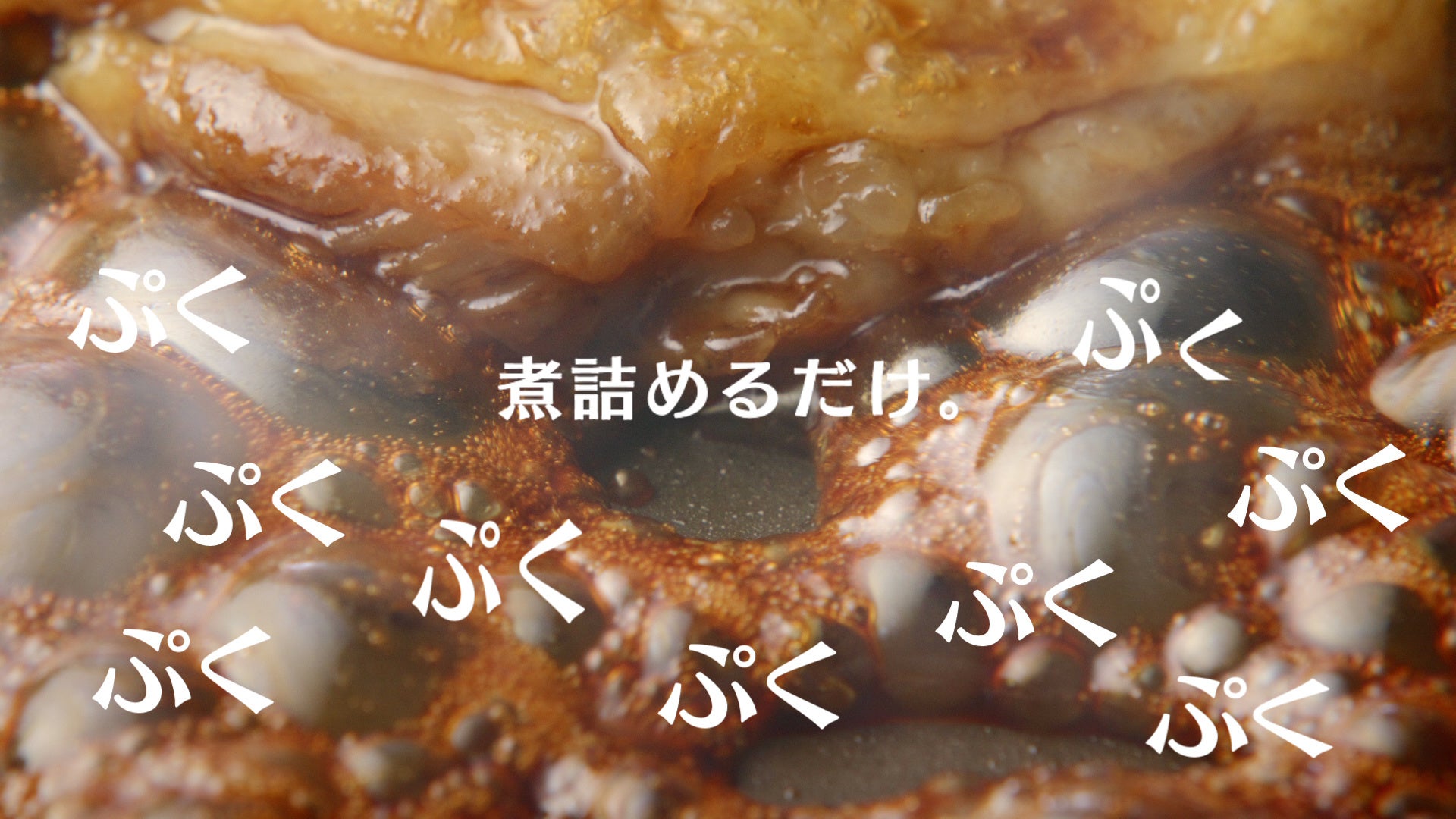 子どもたちのかわいらしい声に合わせたシズル感たっぷりの映像で、調理工程が紹介されます。『すき焼のたれ 甘旨レシピ甘旨チキン篇』では、鶏肉を「じゅーじゅー」焼き、たれをからめて、「ぷくぷくぷく」と煮詰める様子を軽快な擬音と共に表現し、「甘旨チキン」が完成します。『すき焼のたれ 甘旨レシピ豚肉の巻煮篇』では、豚肉を「まきまき」、フライパンで「じゅじゅー」焼いて、「ことことこと」煮込む様子を表現し、「豚肉の巻煮」が完成します。思わず食欲がそそられ、さっそく作ってみたくなる内容です。