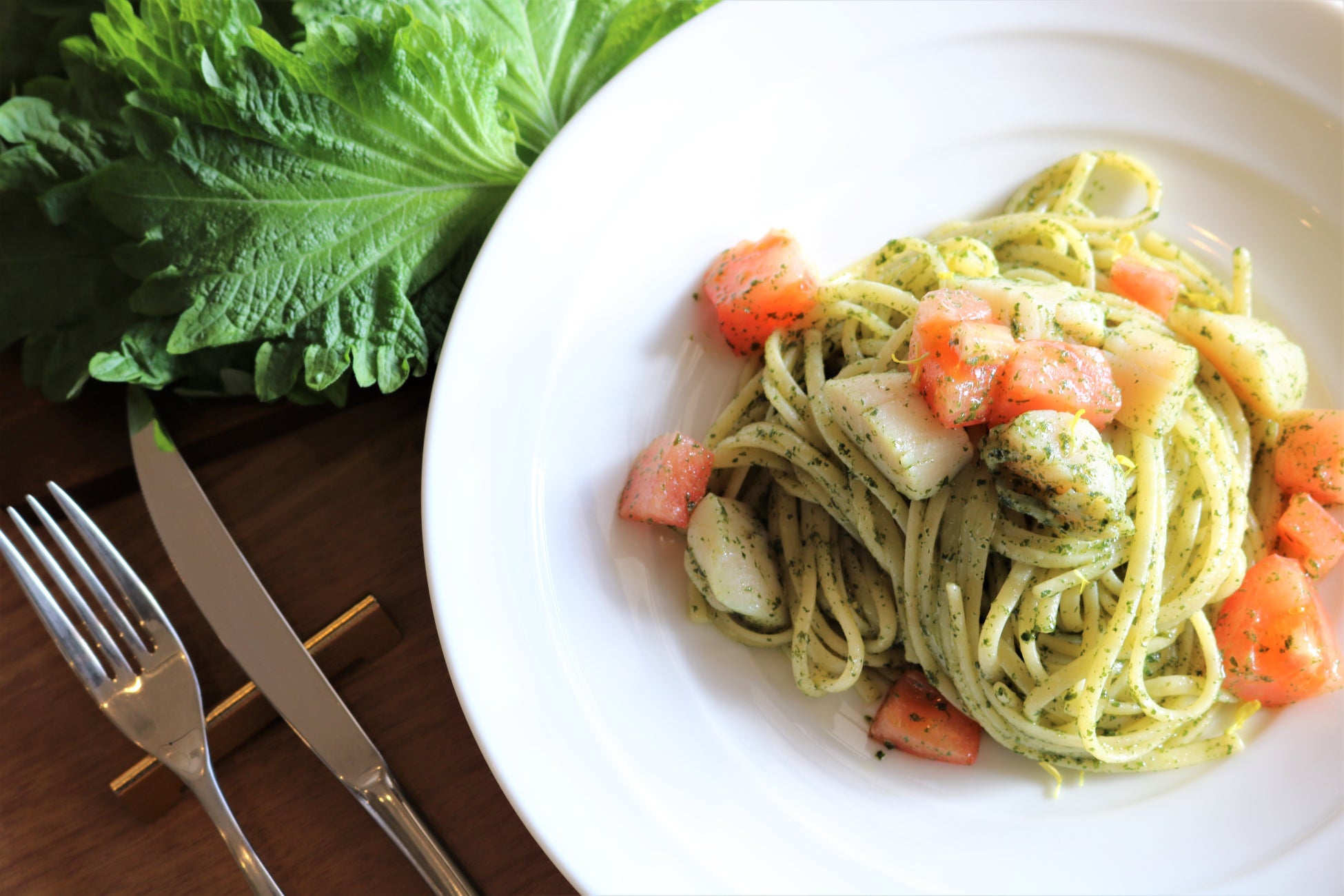 また、パスタのおすすめは豊橋産の青じそを使ったパスタ。青じそは愛知県が全国生産量1位であり、豊橋市が主たる生産地。豊橋の青じそ農家から直送で仕入れてパスタのソースにしています。