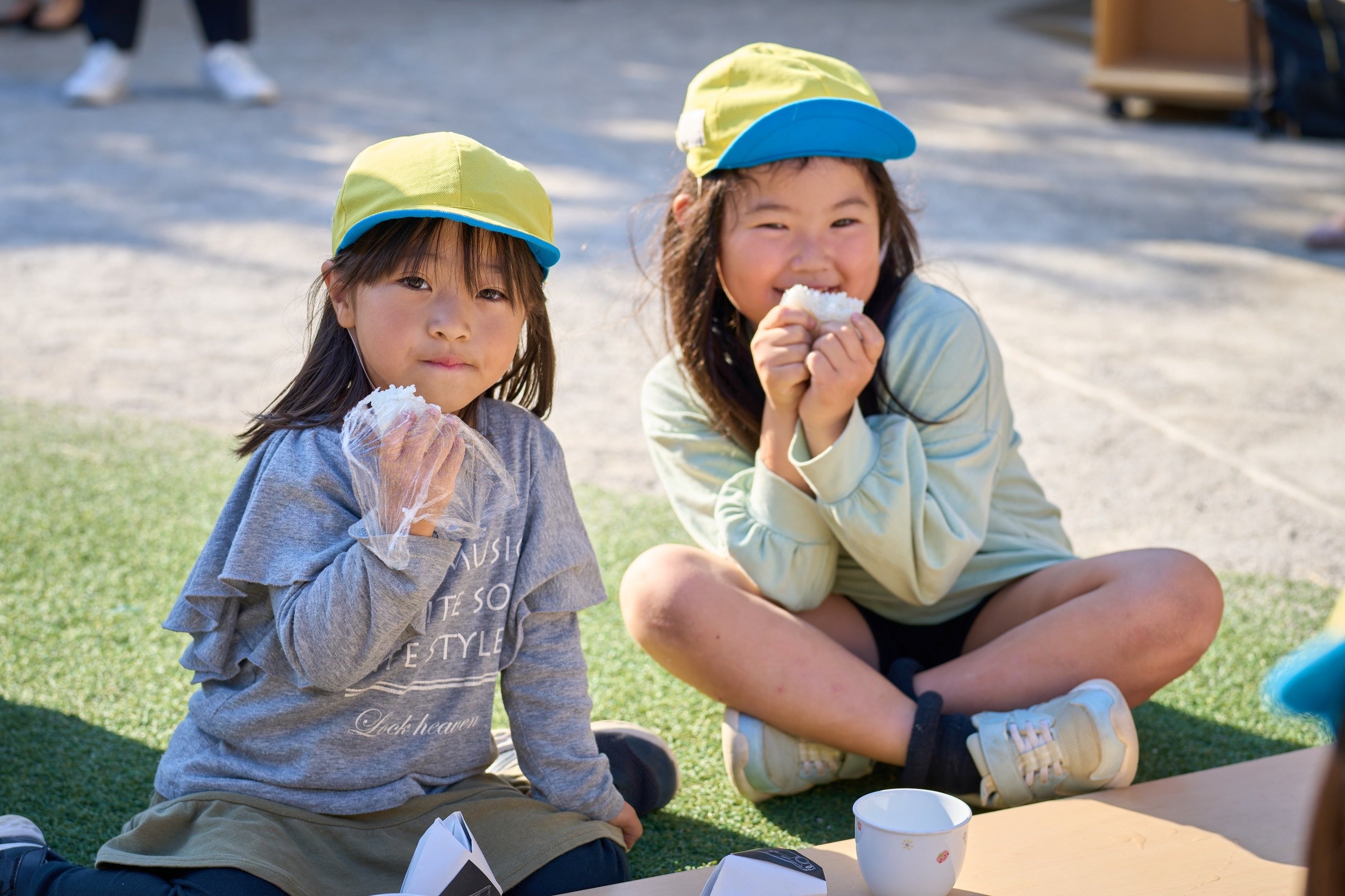 次はおにぎりでおやつタイム。「今日のおやつは塩おにぎりです!」と発表すると子どもたちからは大きな歓声が。普段子どもたちが食べている「すくすくOisix」の保育園給食メニューでも、おにぎりはおやつのメニューとして大人気だそう。お友達とワイワイ会話しながら、大きな口でおにぎりをほおばっていました。