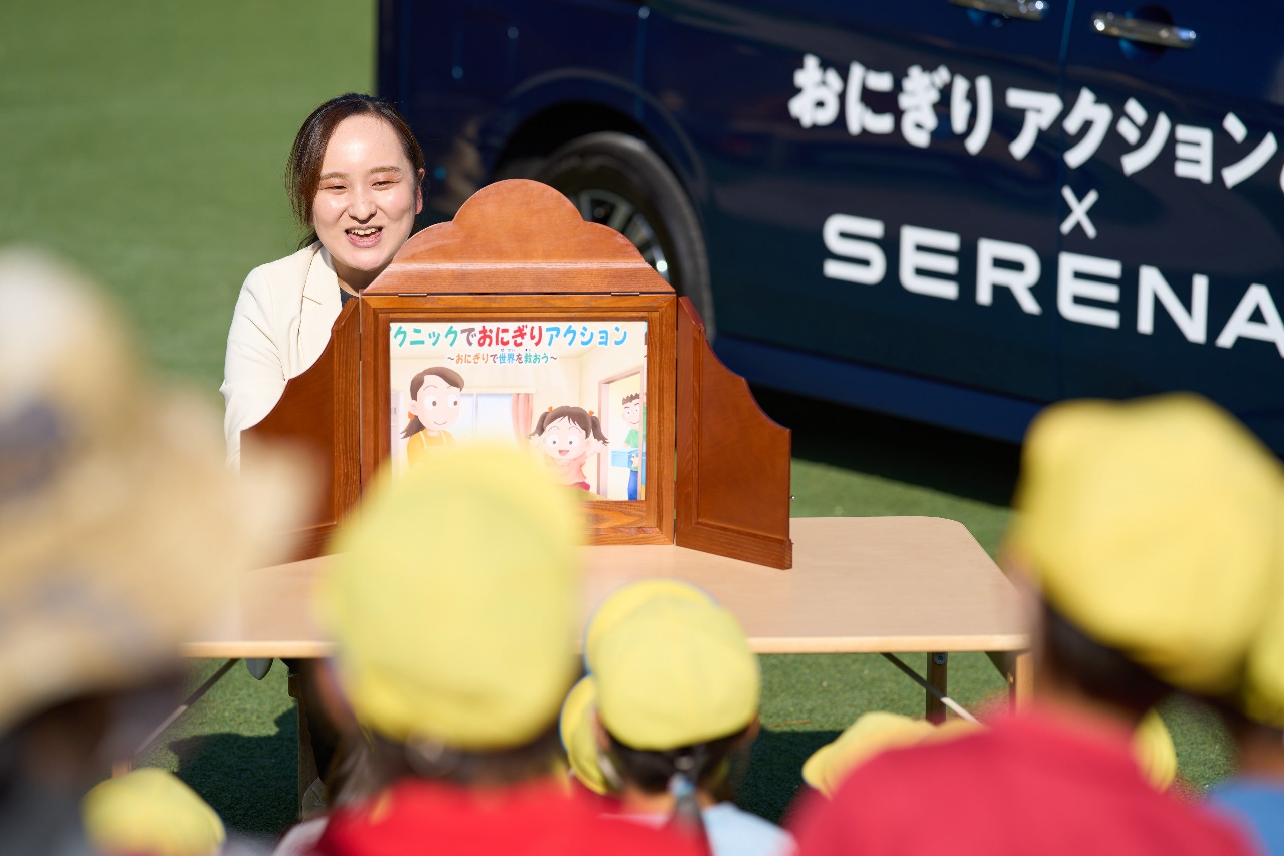 イベントでは、「日産セレナおにぎりアクション号」が子どもたちを園庭でお出迎え。まず最初に、車の前で紙芝居の読み聞かせが行われました。紙芝居のタイトルは「ピクニックでおにぎりアクション!〜おにぎりで世界を救おう〜」。主人公の女の子がピクニックに持っていくおにぎりをお母さんと作りながら、日々の美味しいごはんはたくさんの人の頑張りのおかげで食べることができることや、世界には美味しいご飯を満足に食べられない人もいること、またそのような人に食べ物を届ける「おにぎりアクション」という取り組みがあることを学びました。