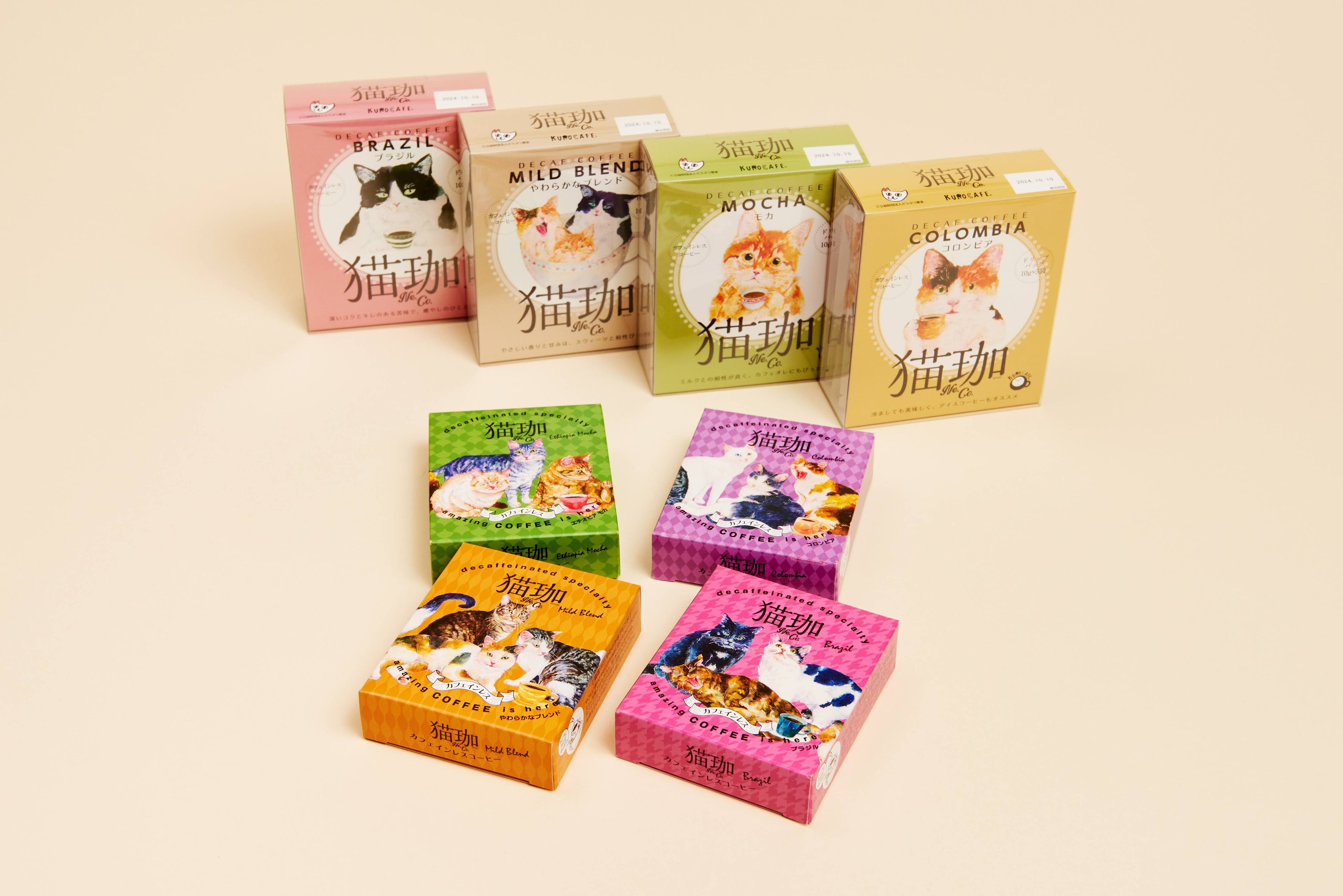 猫のイラストパッケージがかわいいカフェインレスコーヒーの「DECAF 猫珈」は、猫好きにはたまらない一品。公益財団法人どうぶつ基金様と提携し、売上の一部を寄付し、猫・犬の殺処分ゼロの社会を目指している。