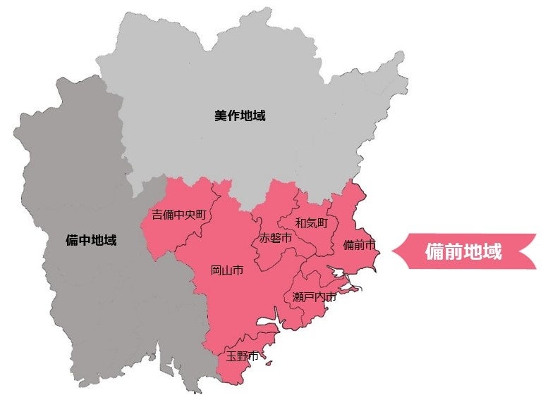 県庁所在地である岡山市をはじめ、玉野市・備前市・瀬戸内市・赤磐市・和気町・吉備中央町の5市2町を有する、岡山県南東部のエリア