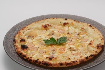 手ごねのピザ生地にホワイトソースとシーフードをふんだんに使った一品