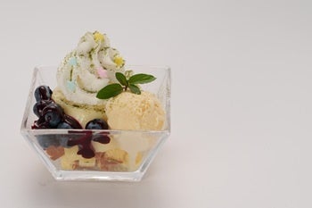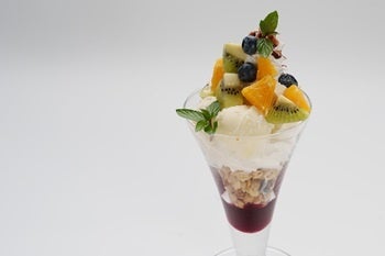 季節のフルーツをたっぷり乗せた、ボリュームたっぷりのパフェ。