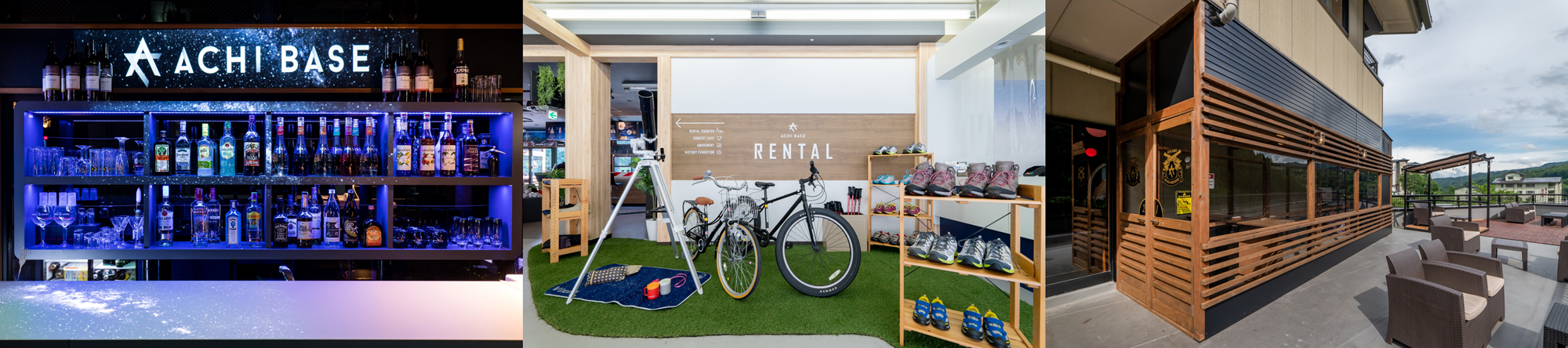 そんな日本一の星空の村にあるACHI BASEは、村内および周辺観光案内、昼神温泉をはじめとした村内宿泊施設の案内・手配に加え、アウトドアグッズのレンタル、阿智村上空を遊覧するバーチャル体験「VR空中ACHIさんぽ」や子供用「KIDSボルタリング」などのアミューズメント施設として営業しています。建物内には飲食スペースを併設しており、テラスでのBBQ、村内の農作物・生産加工品を使ったコンセプトカフェとして営業しています。