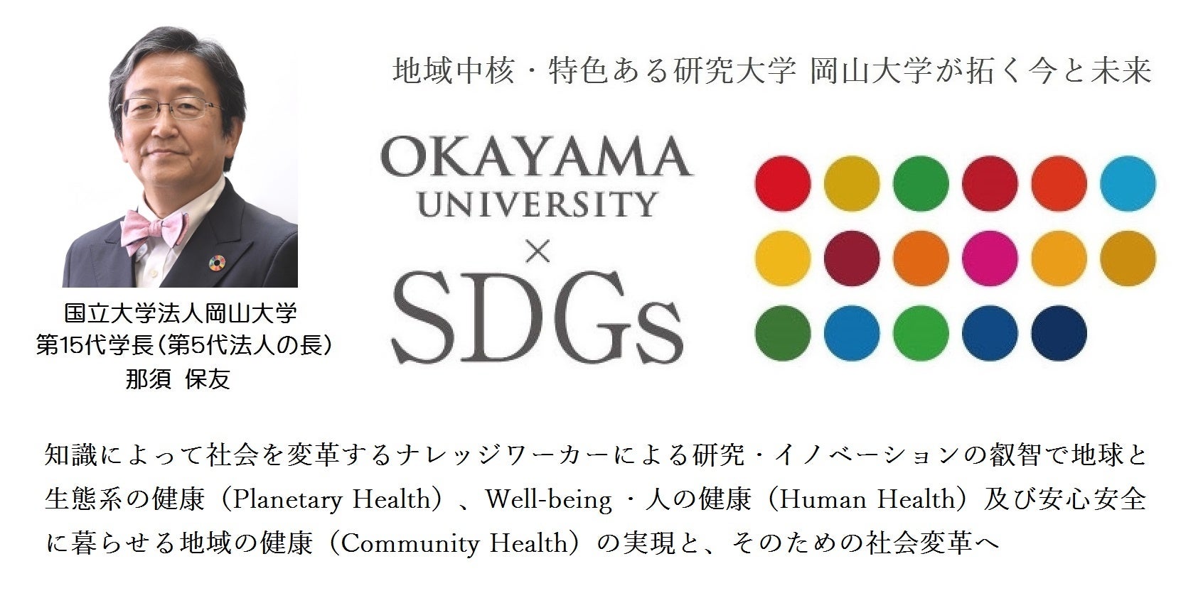 国立大学法人岡山大学は、国連の「持続可能な開発目標(SDGs)」を支援しています。また、政府の第1回「ジャパンSDGsアワード」特別賞を受賞しています。地域中核・特色ある研究大学として共育共創を進める岡山大学にご期待ください
