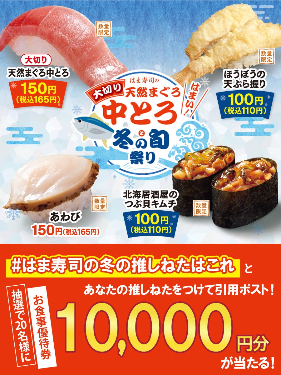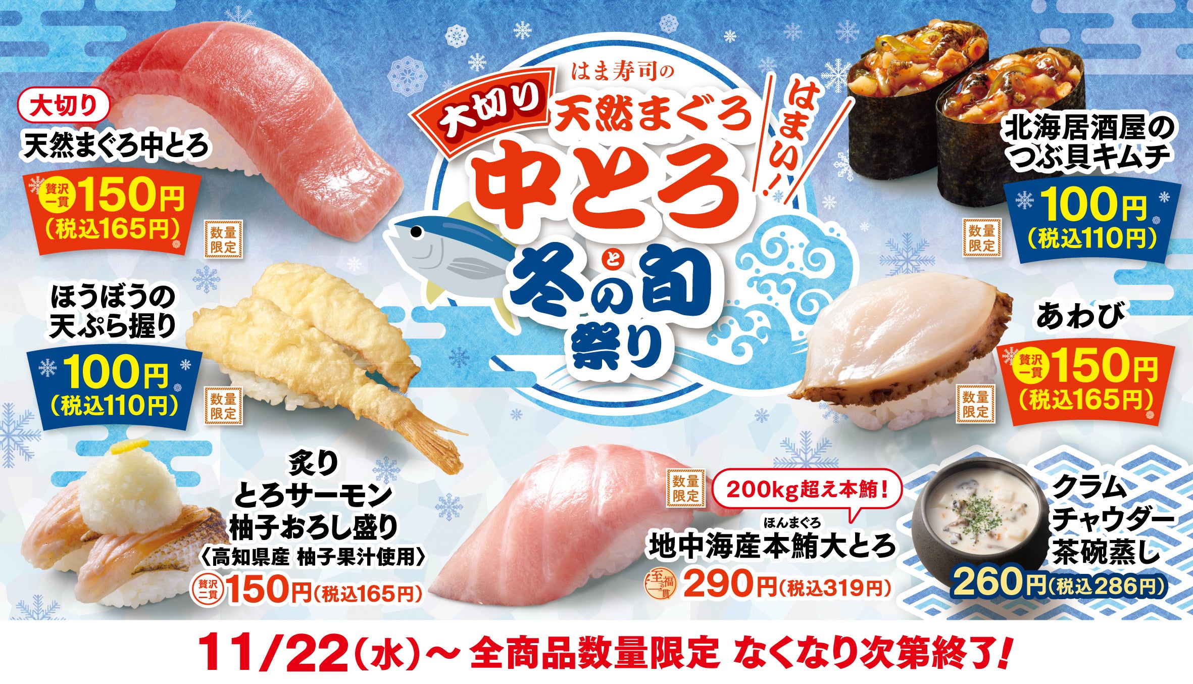 ぜひこの機会に、お近くのはま寿司で「はま寿司の大切り天然まぐろ中とろと冬の旬祭り」をお楽しみください。