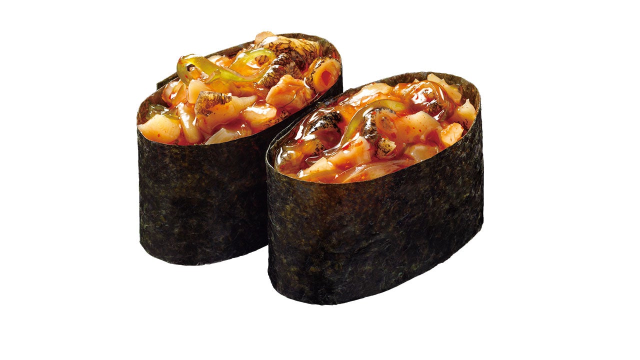 また、つぶ貝の歯ごたえとキムチのピリ辛な味わいがクセになる「北海居酒屋のつぶ貝キムチ」や、外はサクサク中はふっくらとした「ほうぼうの天ぷら握り」、コリコリとした食感がクセになる「あわび」、香ばしく炙ったとろサーモンに高知県産柚子果汁がアクセントとなる「炙りとろサーモン柚子おろし盛り〈高知県産 柚子果汁使用〉」も登場します。