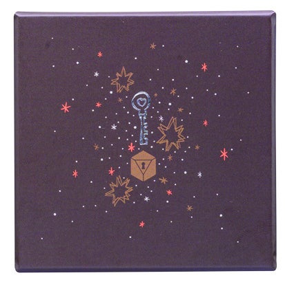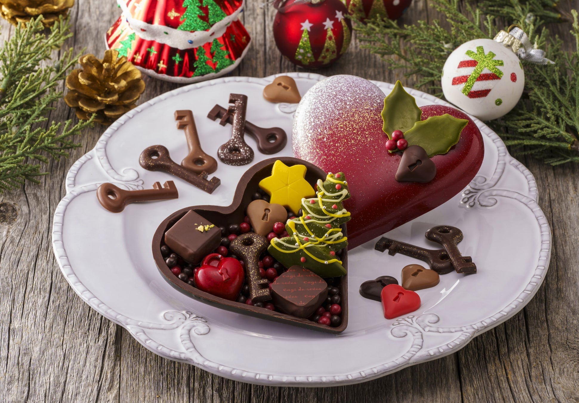 ひいらぎをあしらった大きなハートの器、ボンボンショコラ3粒(ナチュール、ピスタチオ、シャンパンフランボワーズ)、鍵型ショコラ1個(カカオ64%)、ハート型ショコラ1個(カカオ33%)、星型ショコラ1個、ツリー型ショコラ、パールショコラ2種(ノワール、フランボワーズ)