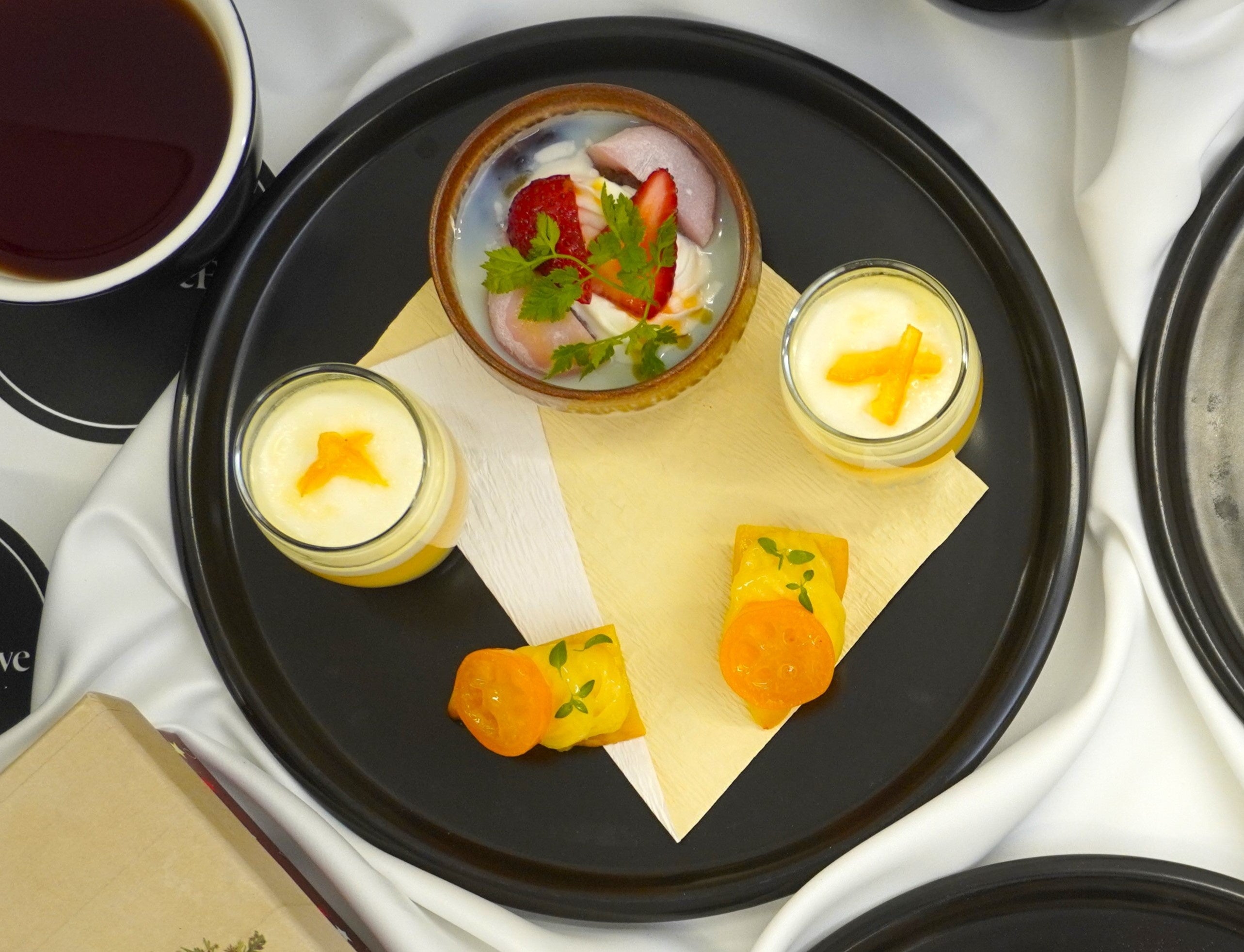 和にアレンジしたスイーツが並ぶ2段目は、温かみのある色合いが冬の景色にそっと溶け込みます。柚子や金柑など冬が旬の柑橘類が爽やかに香る一皿です。
