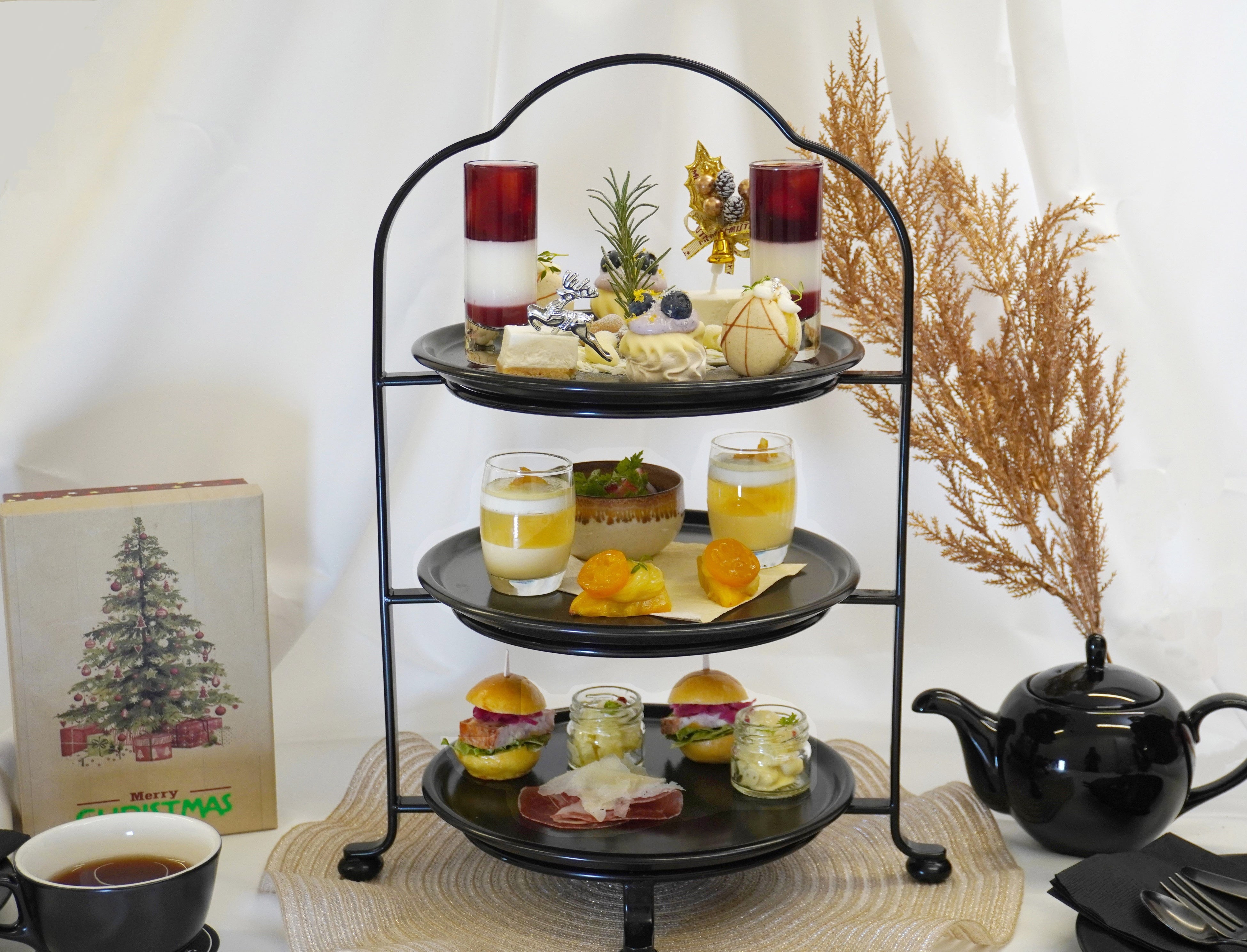 1段目は雪やきらびやかなイルミネーションを思わせる華やかなスイーツ達。2段目は和を取り入れたプリンやスイートポテトなど、お馴染みのスイーツでほっと一息。3段目はパーティーシーンにかかせない生ハムやミートローフをアレンジしたセイボリーが並びます。