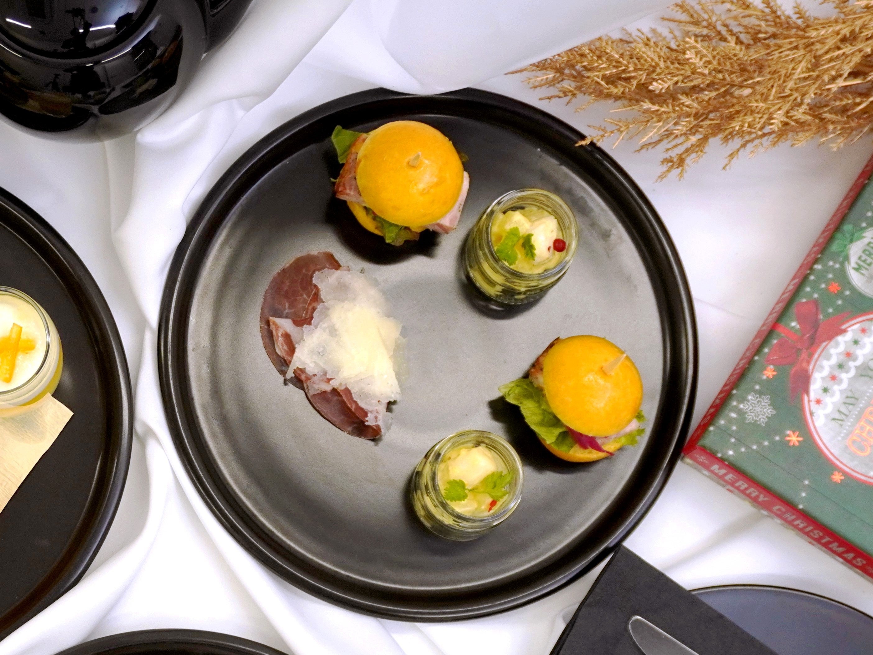 福岡市名産の甘みある大根とハーブを使用したサラダや、可愛い見た目のミニバーガーなど冬のひとときを盛り上げるセイボリー達。お酒にも相性のよい一皿に仕上げています。