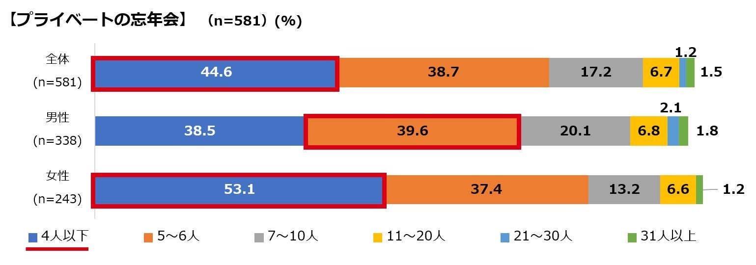 また、コロナ禍では二次会需要が低下しましたが、今回は「二次会」の参加意向も、プライベートで5割を超える結果となりました。職場・仕事関係でも4割となりましたので、忘年会ならではの開放感も相まって、この冬は遅い時間も繁華街に賑わいが絶えないかもしれません。
