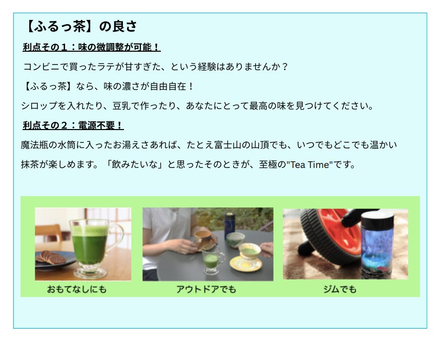 3. 抹茶シェイカー「ふるっ茶」は、10秒振るだけで本格お抹茶が点てられます(日米で特許取得)