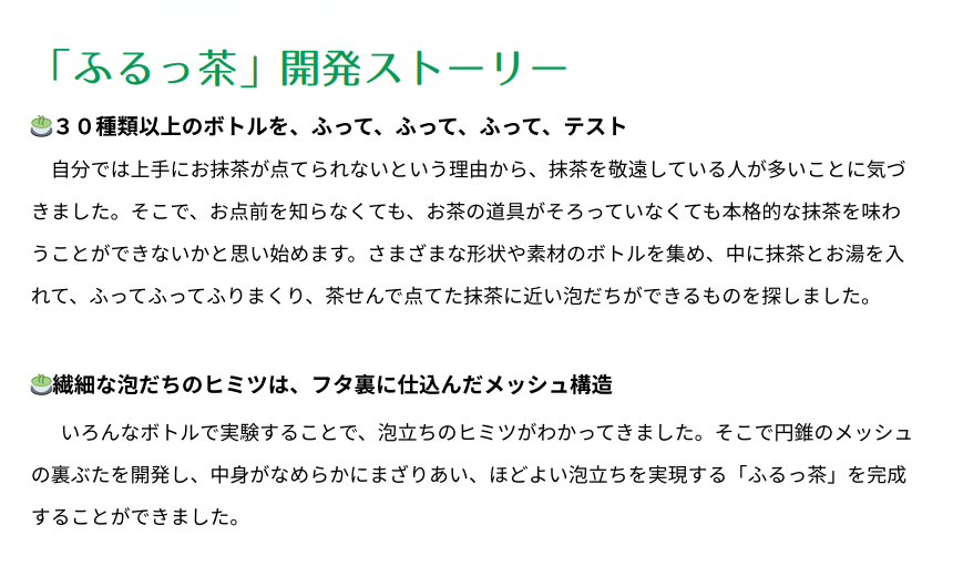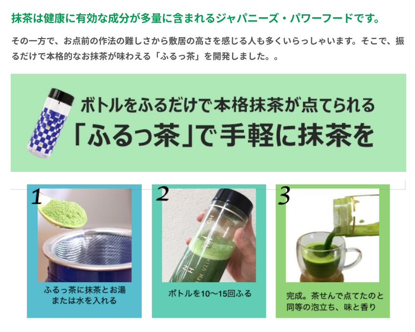 3. 抹茶シェイカー「ふるっ茶」は、10秒振るだけで本格お抹茶が点てられます(日米で特許取得)