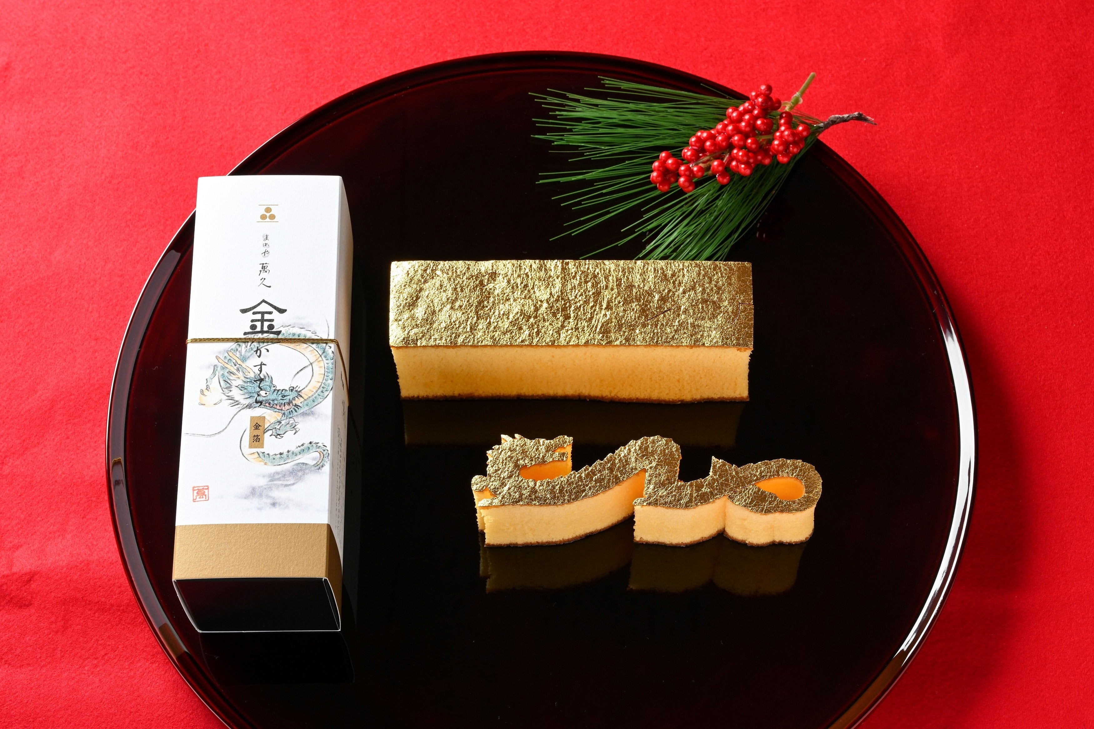 金箔一枚張りのカステラに辰のデザインカットを施しました。