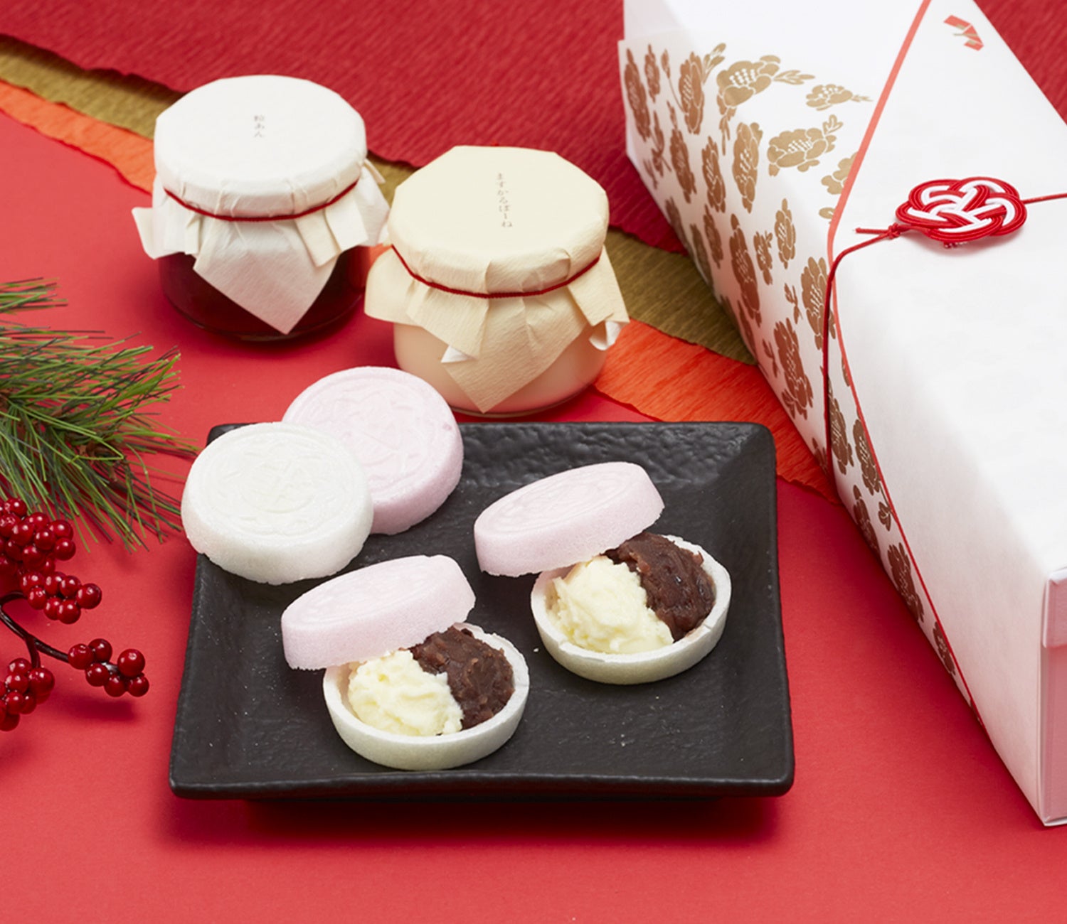 色 京都祇園あのんの代表商品「あんぽーね」から、縁起の良い紅白最中が登場します。
