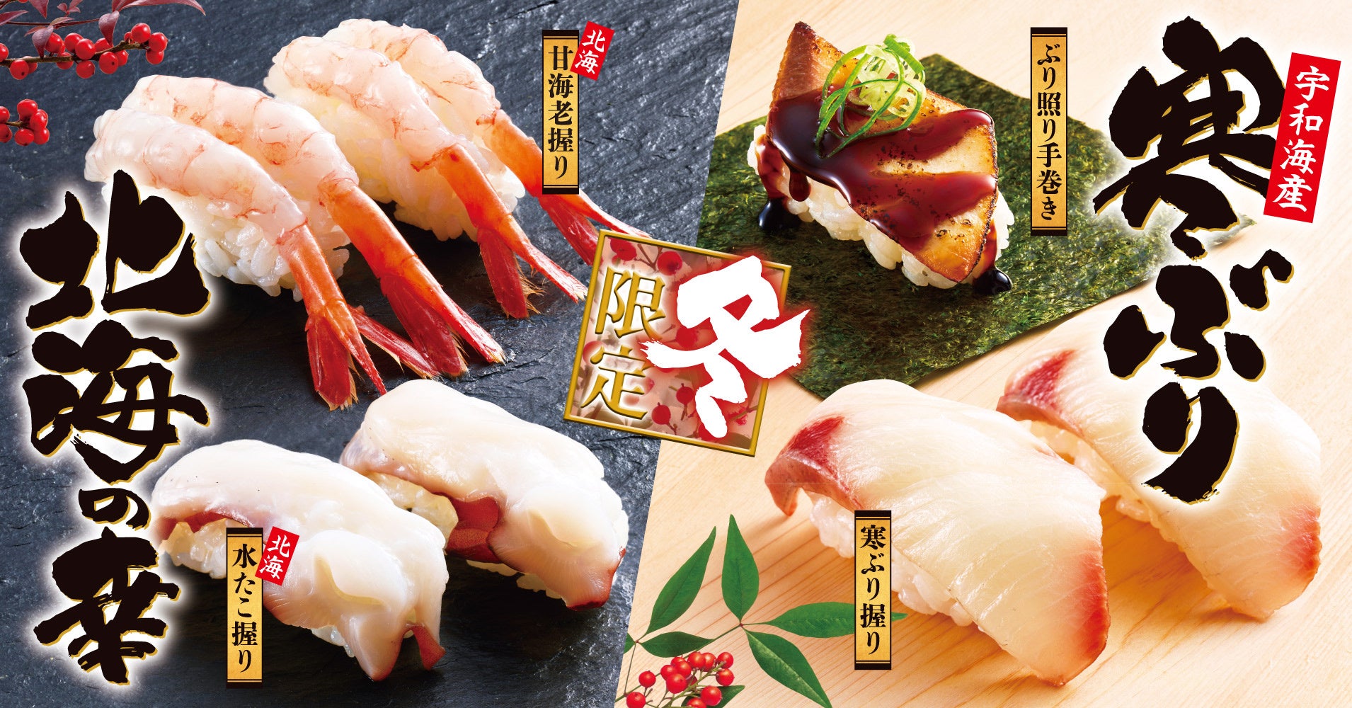 冬が旬の宇和海で育った脂乗りが良い寒ぶりを、素材の味をそのまま味わっていただける握りと、香ばしく焼き上げた照り焼き手巻きをご用意いたしました。また、「北海 甘海老握り」はプリっとした食感と濃厚な海老の旨味が広がり、「北海 水たこ握り」は柔らかくて甘味のある味わいがクセになります。北海の幸もぜひご賞味ください。