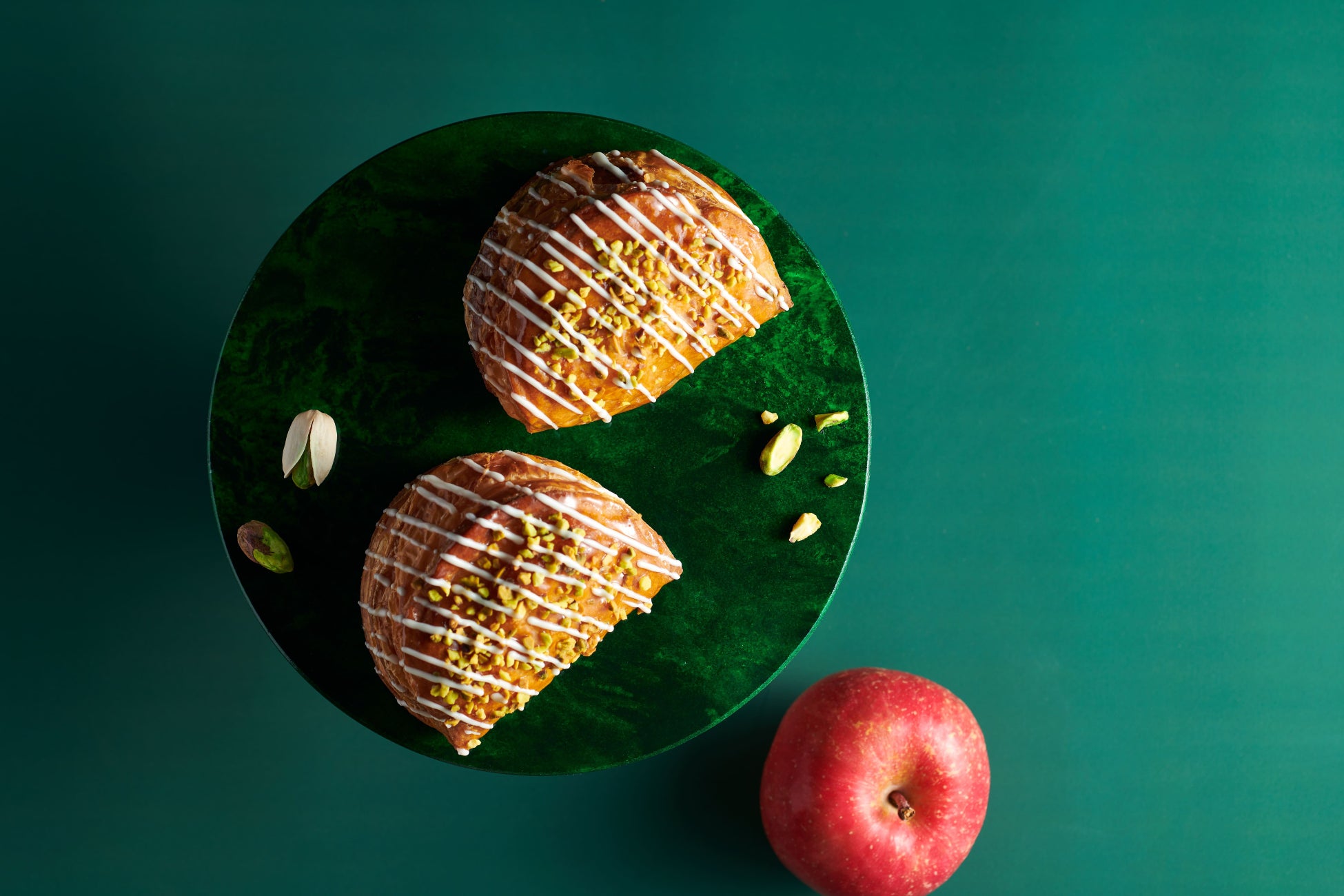 香ばしいピスタチオローストペーストを合わせたカスタードクリームと甘酸っぱいりんごプレザーブの組み合わせでリッチな味わいが口いっぱいに広がります。ホワイトチョコレートコーチングとピスタチオのトッピングで仕上げ、華やかな見た目に仕上げました。