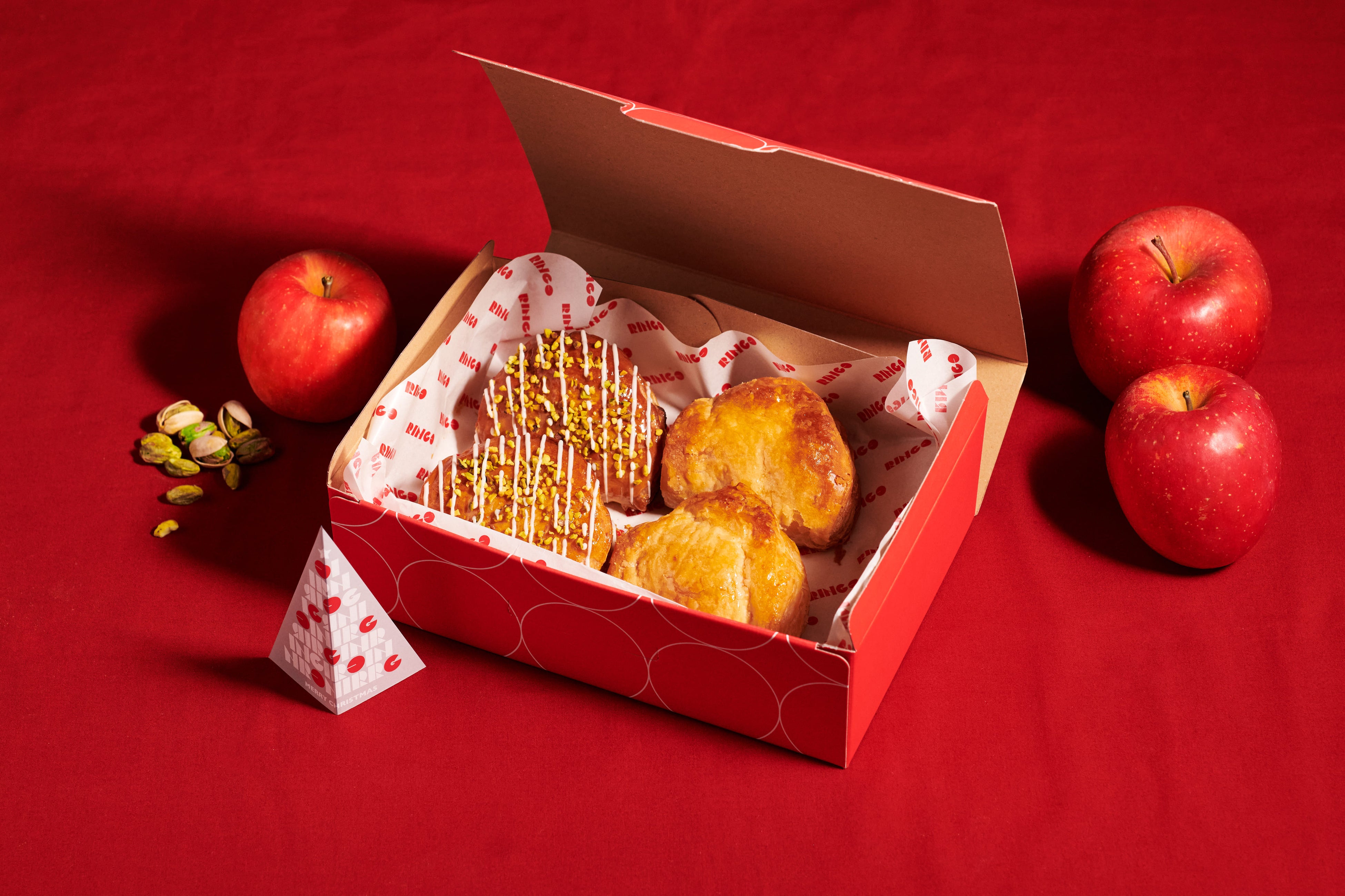 香ばしいピスタチオローストペーストを合わせたカスタードクリームと甘酸っぱいりんごプレザーブの組み合わせでリッチな味わいが口いっぱいに広がります。ホワイトチョコレートコーチングとピスタチオのトッピングで仕上げ、華やかな見た目に仕上げました。