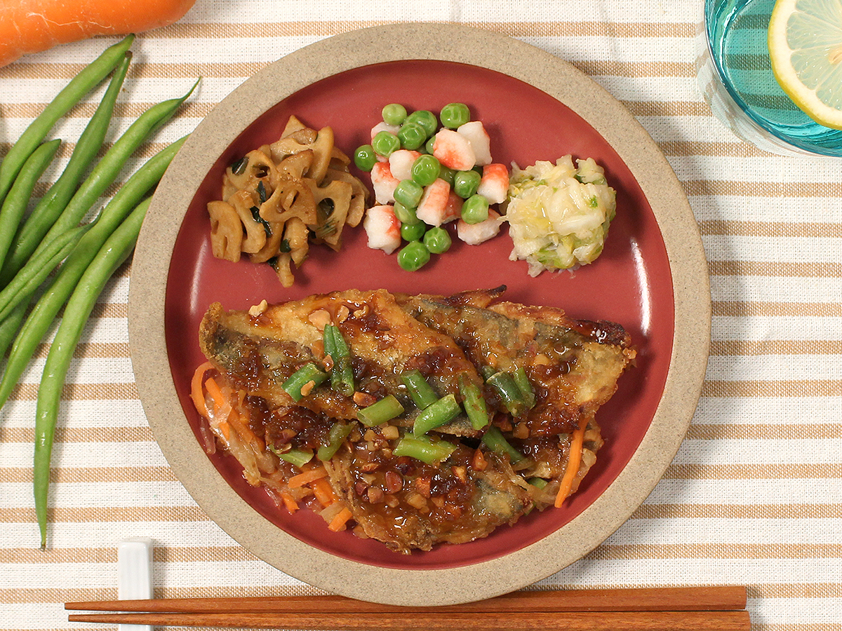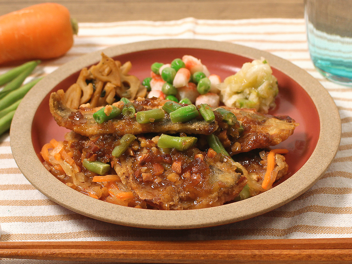 カラッと揚げたアジの竜田揚げにスイートチリソースがピリッと効いた香味だれをかけています。アーモンドとインゲンをトッピングしており、竜田揚げ・野菜・アーモンドと様々な食感が楽しめます。