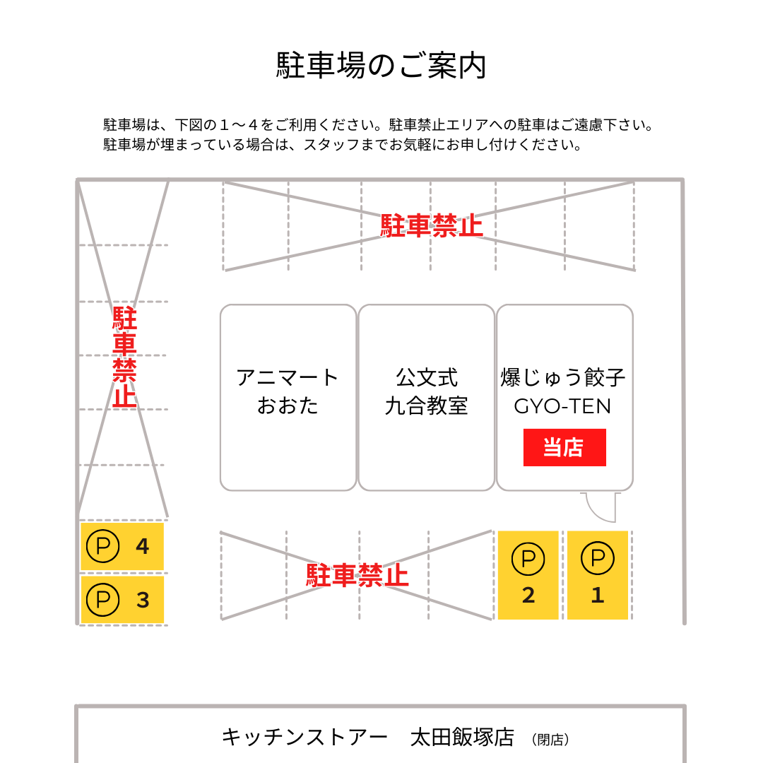 爆じゅう餃子 餃点は、2021年6月9日に餃子のテイクアウト専門店として、プレハブ店舗で営業をしてきましたが、この度、『爆じゅう餃子 GYO-TEN』に店名を改め、今まで通りの焼き餃子・冷凍餃子のテイクアウトに加え、店内にてお食事、お酒をお楽しみいただける空間として移転・リニューアルオープンいたします。移転先は、同じ敷地内のテナントになります。