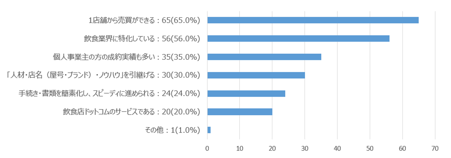 さらに、「興味がある」と回答した人で、どの特徴に興味を持ったかを聞いたところ、「1店舗から売買ができる」が最も高く(65.0%)、飲食業界に特化している(56.0%)、「個人事業主の方の成約実績も多い」(35.0%)と続く結果となりました。