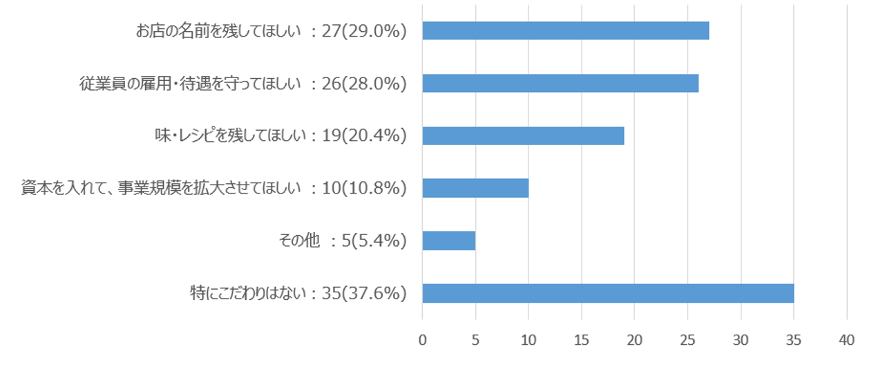 さらに、事業承継を考えている方に、後継者に期待することについて聞いたところ、「お店の名前を残してほしい」(29.0%)、「従業員の雇用・待遇を守ってほしい」(28.0%)、「味・レシピを残して欲しい」(20.4%)という結果になりました。