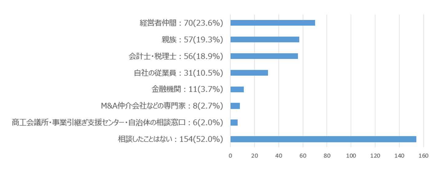 続いて、将来の事業の方向性や承継について、実際に相談したことがある相手を聞いたところ、最も多かったのは「相談したことはない」(52.0%)、続いて「経営者仲間」(23.6%)、「親族」(19.3%)、「会計士・税理士」(18.9%)という結果になりました。
