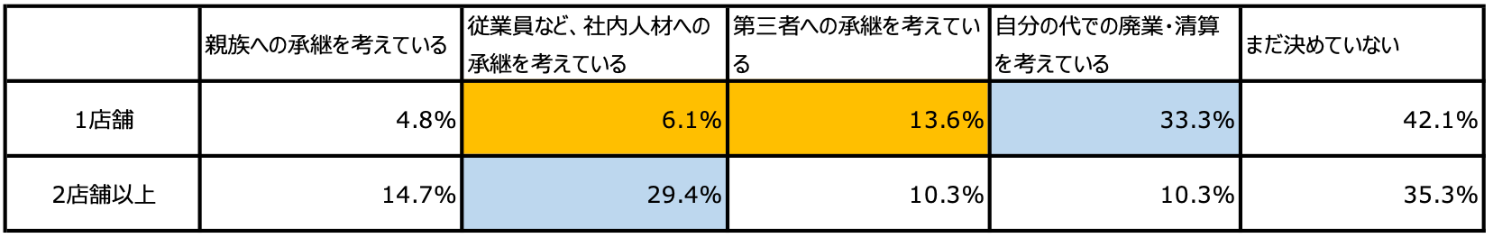 また、回答者の運営店舗数別で回答を見てみると、「まだ決めていない」の次に多かったのは1店舗運営では「自分の代での廃業・清算を考えている」(33.3%)、2店舗以上運営では「従業員など、社内人材への承継を考えている」(29.4%)と傾向が分かれました。2店舗以上運営している飲食店では、社内である程度後継者として目処のつく人がいることがわかります。