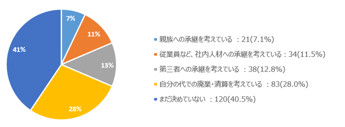 次に、現在の事業の後継者について聞いたところ、「まだ決まっていない」(40.5%)が最も多く、次いで「自分の代での廃業・清算を考えている」(28.0%)という結果になりました。