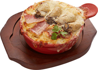 燻製したスカモルツァチーズを使用したパスタに、ソテーすることで旨みを引き出した牡蠣とベーコン、温野菜をあわせ、最後にミックスチーズをのせてオーブンで焼き上げた冬のごちそうパスタです。ジューシーに焼き上げた牡蠣とベーコンは、クリーミーなパスタや温野菜とベストマッチ。別添えの西洋わさびやブラックペッパーを加えると、ピリッとスパイシーな味わいへの変化をお楽しみいただけます。