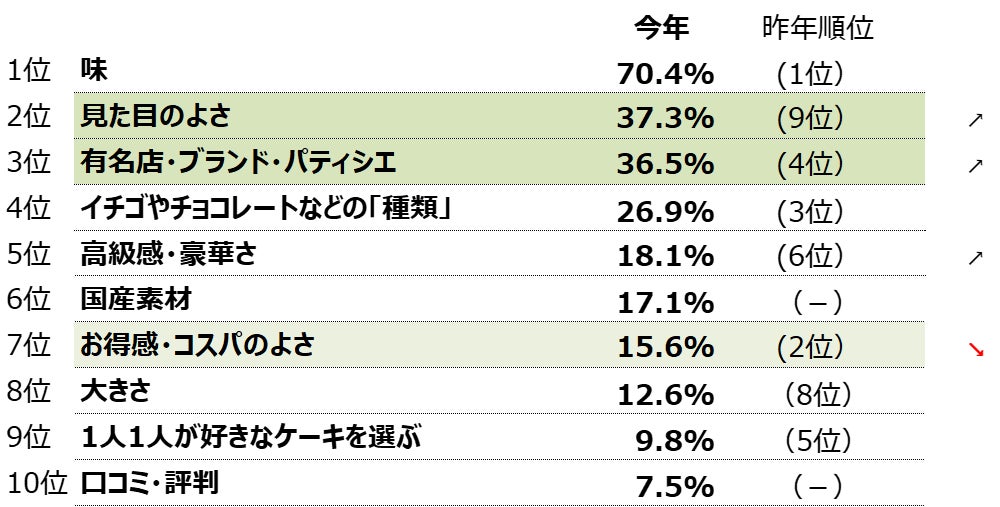 クリスマスケーキを選ぶポイントでは、味はもちろん重視するが、「見た目の良さ」や「有名店・ブランド・パティシエ」を選ぶ方がそれぞれ3割以上いることから、みんなで集まるクリスマスに見て楽しめるビジュアル、どこで買ったかなど、話して楽しめるクリスマスケーキを求めていることが伺える。また、価格に関しては、「お得感・コスパのよさ」が昨年の2位から7位に下降。物価高による懸念はあまり見受けられなかった。 |