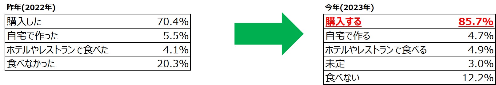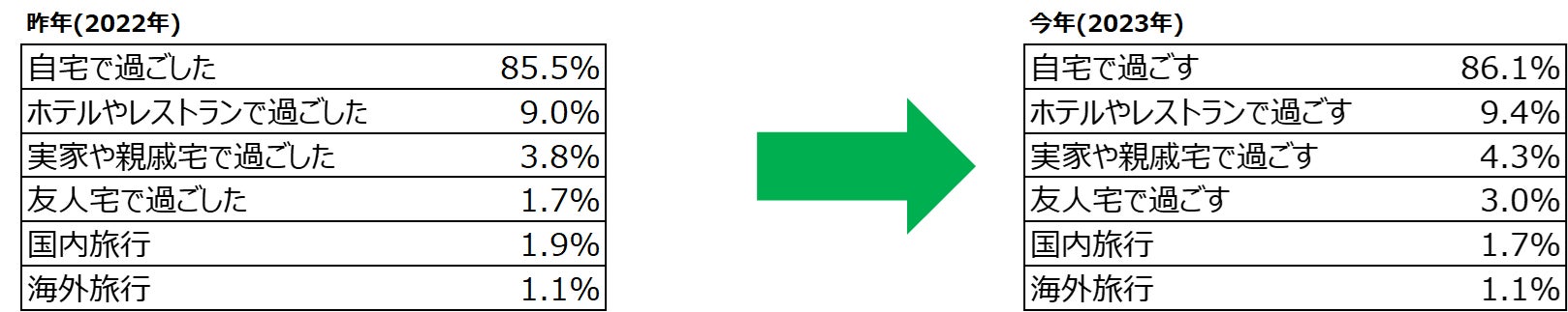 昨年と比べて大きな変動はなく、8割以上の方が自宅で過ごすと回答。 円安の影響を受け、今年も旅行に行く意識はまだ増えていないが、みんなで集まって過ごすクリスマスへの期待感が伺える。 |