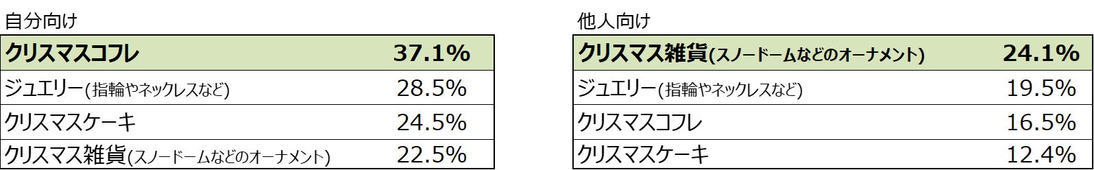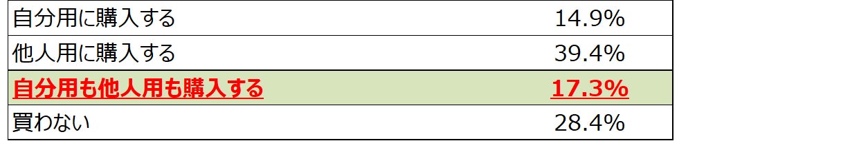 今年のクリスマスプレゼントは、自分用も他人用も購入すると17.3%が回答。ここでも物価高の影響は見られず、消費への前向きな動きが見られる。 |