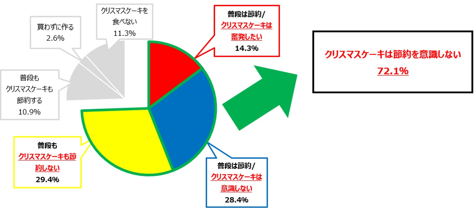 水道光熱費や原材料の値上げなど、物価高騰が続いているが、全体の約7割は、クリスマスケーキでの節約は意識せず、 うち14.3 %はクリスマスケーキは奮発したいと回答 。 1 年に 1 回のイベントだからこそ、「クリスマスケーキは華やかで豪華なものが欲しい」という需要は大きい。 |