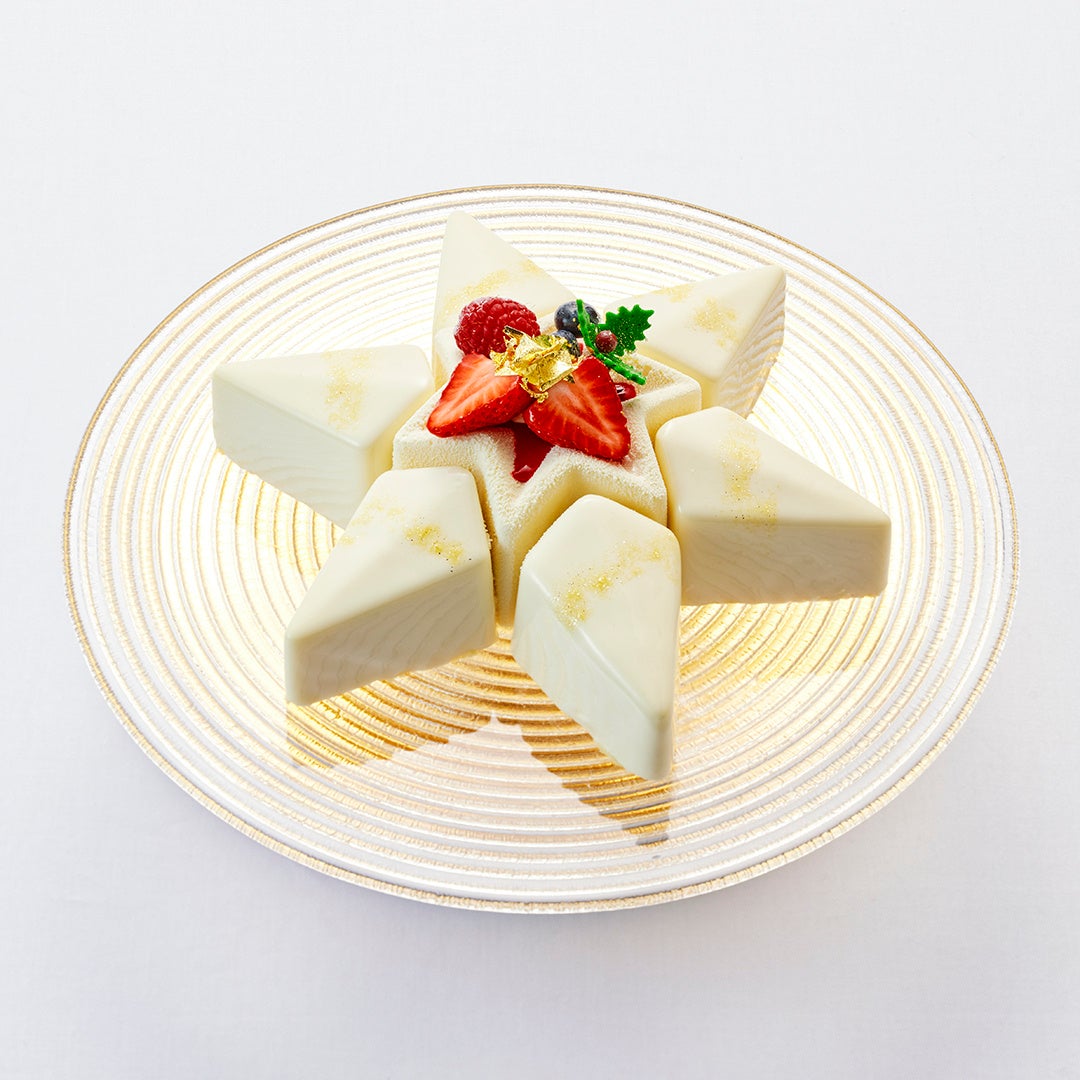 白い星型のケーキは、なめらかな艶が美しいホワイトチョコレートのグレースでコーティング。中央部分は甘酸っぱいベリーコンポートをレモン風味のパン・ド・ジェンヌで包み、外側のパーツは香ばしいヘーゼルナッツのビスキュイとサクサクした食感が楽しいプラリネを土台に、チョコレートムースとベリーコンポートをパッションフルーツで風味付けをしたホワイトムースで包みました。