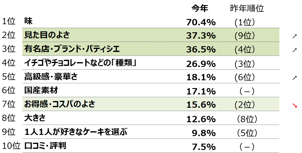 クリスマスケーキを選ぶポイントでは、味はもちろん重視するが、「見た目の良さ」や「有名店・ブランド・パティシエ」を選ぶ方がそれぞれ3割以上いることから、みんなで集まるクリスマスに見て楽しめるビジュアル、どこで買ったかなど、話して楽しめるクリスマスケーキを求めていることが伺える。また、価格に関しては、「お得感・コスパのよさ」が昨年の2位から7位に下降。物価高による懸念はあまり見受けられなかった。 |