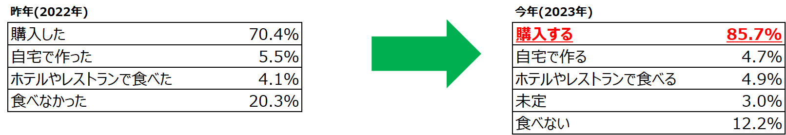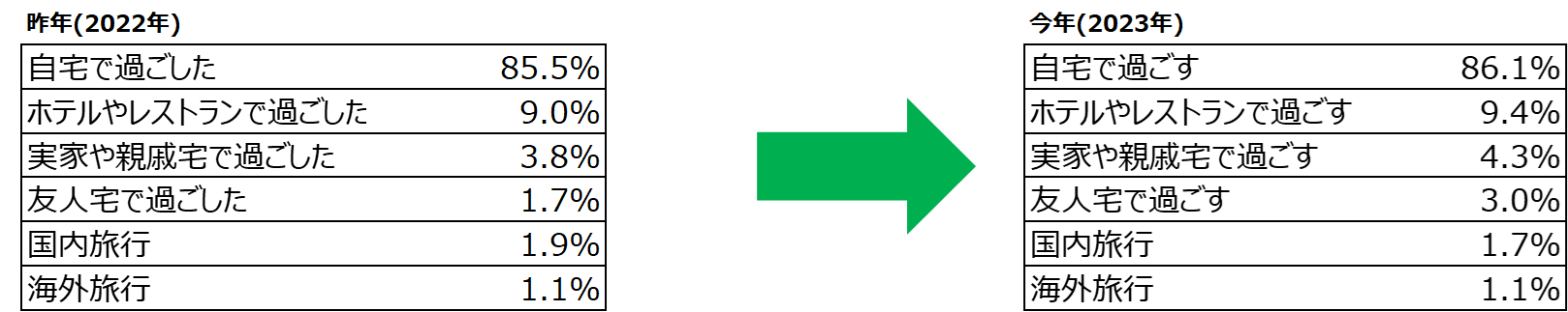 昨年と比べて大きな変動はなく、8割以上の方が自宅で過ごすと回答。 円安の影響を受け、今年も旅行に行く意識はまだ増えていないが、みんなで集まって過ごすクリスマスへの期待感が伺える。 |
