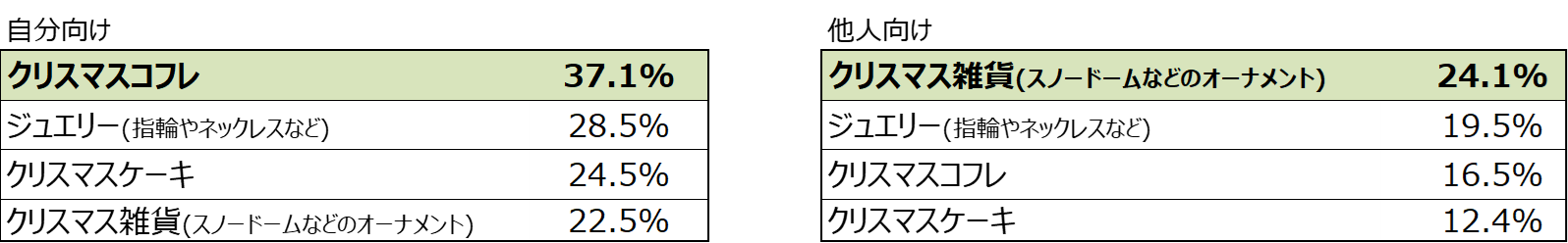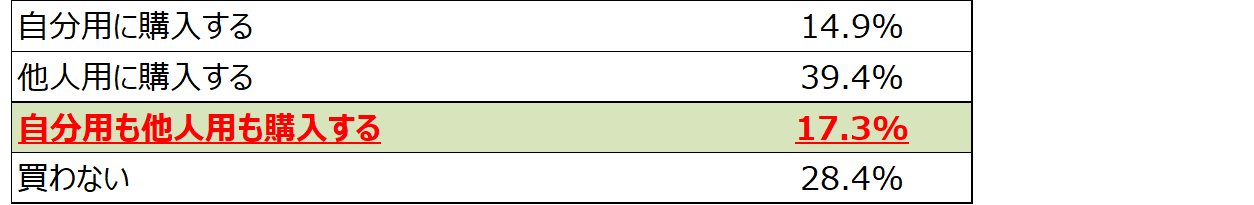 今年のクリスマスプレゼントは、自分用も他人用も購入すると17.3%が回答。ここでも物価高の影響は見られず、消費への前向きな動きが見られる。 |