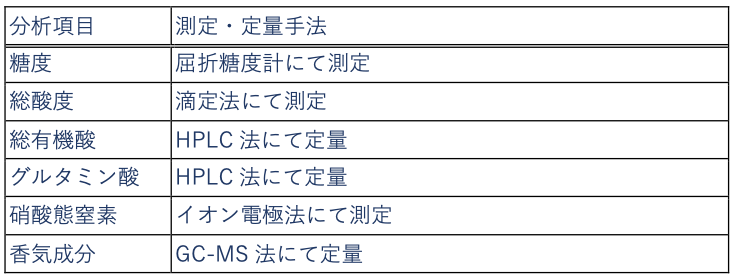 測定・定量については、香気成分以外は各柑橘の果汁を使用し、香気成分のみ果汁および果皮を使用して分析・調査を実施