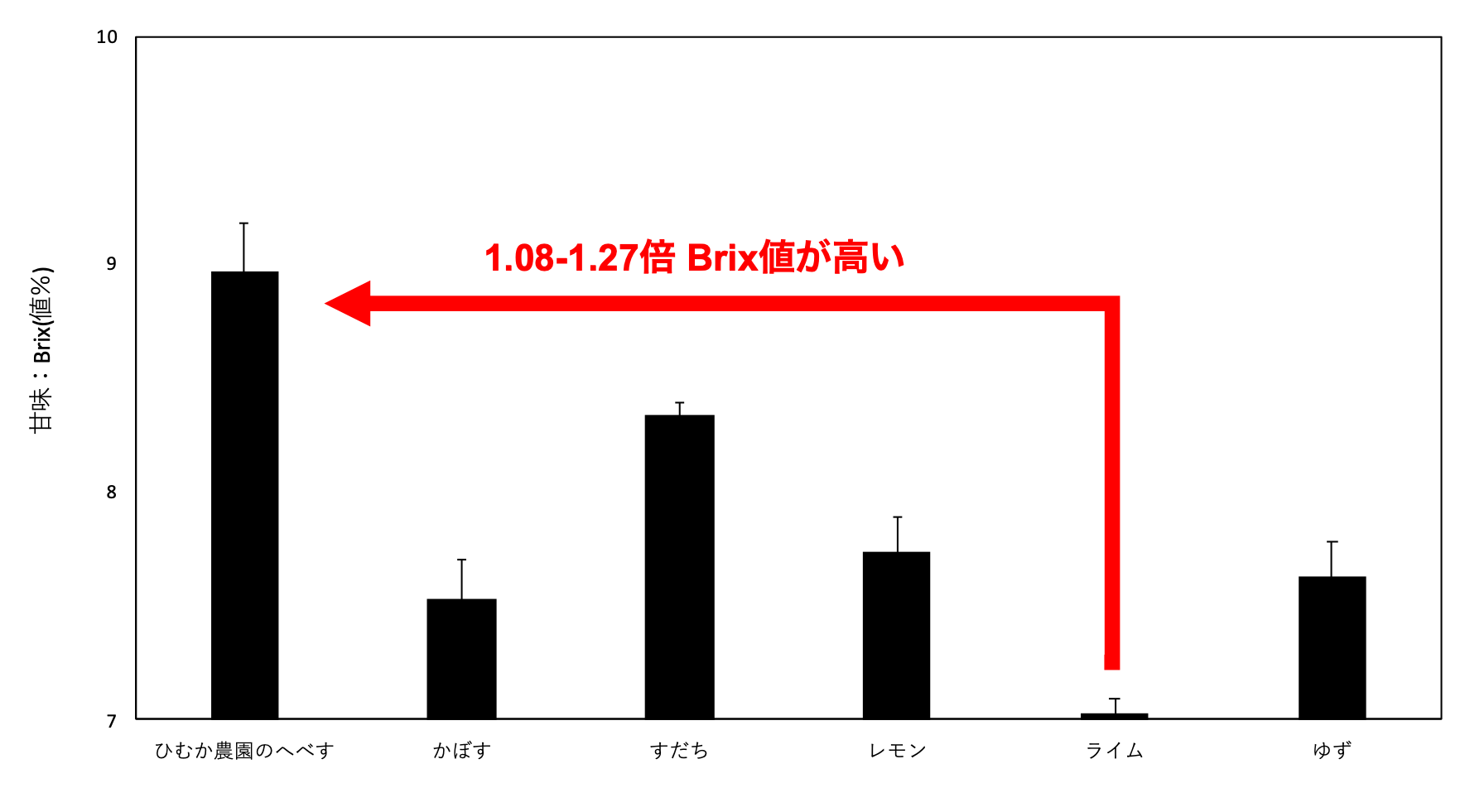 「ひむか農園のへべす」の糖度はかぼす、すだち、レモン、ライムおよびゆずよりも1.19倍、1.08倍、1.16倍、1.27倍および1.17倍高い
